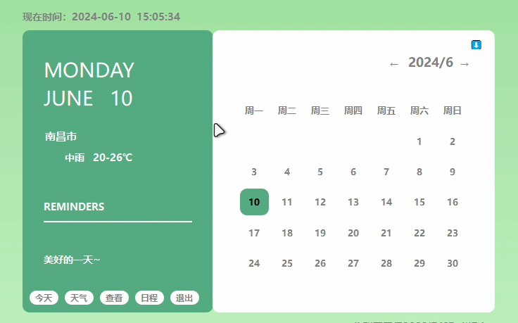 - 主窗口日历默认显示当前月份,用户可通过点击“今天”按钮快速返回当前日期,或点击年份输入框手动输入年份和月份跳转至指定日期。