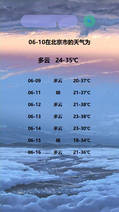 - 在输入框输入城市信息后,点击右侧查询按钮,即可在窗口中展示所选城市的天气预报,包括日期、天气状况、温度范围、风向风力等信息。