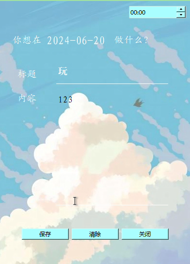 - 在“标题”输入框输入日程标题,在“内容”输入框输入详细内容,点击“保存”按钮将日程信息保存为json文件,点击“清除”按钮可清空输入框内容,点击“关闭”按钮关闭日程创建窗口。
