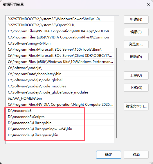 输入下面的五个环境变量,注意,"D:\Anaconda3"都修改为你的Anaconda的安装路径。