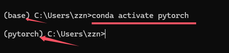 将环境激活:conda activate pytorch ,左边的环境就从base(基本环境),变成了pytorch环境。