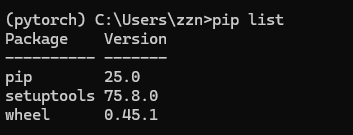 输入pip list,查看当前环境下面有哪些包,我们发现没有pytorch,那么下面我们就需要安装它