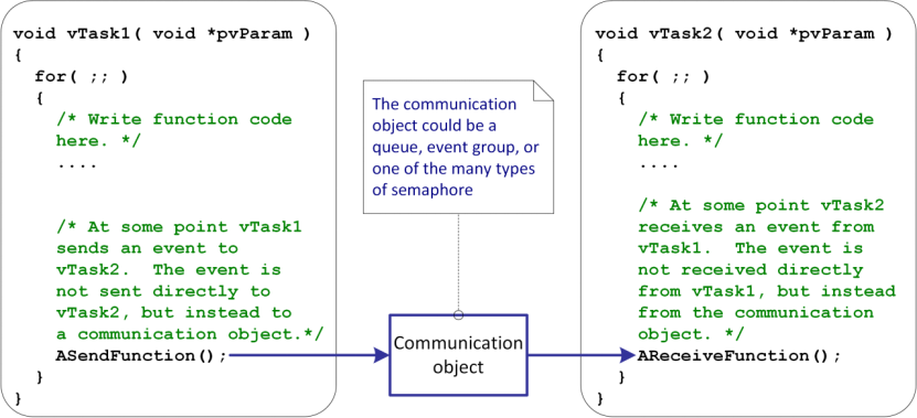 大多数任务间通信方法通过中间对象,如队列、信号量或事件组。发送任务写入通信对象,接收任务从通信对象读取。当使用直接任务通知时,顾名思义,发送任务直接向接收任务发送通知,而无需中间对象。